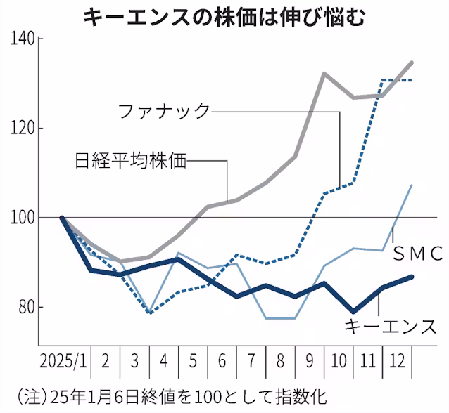 キーエンスの株価は伸び悩む。29日終値は5万8780円と、1年前と比べて16%下落した。同期間に36%上昇した日経平均株価のほか、FA業界のファナックやSMCなどと比べても見劣りする。