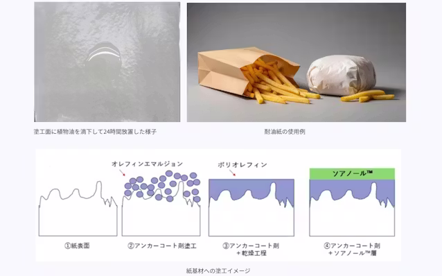 ソアノールは他の樹脂と溶融させて熱成形しフィルムやシートなどの食品包装材として用いられる。食品の風味や品質を長持ちさせフードロス削減にも役立つ。フライドチキンやハンバーガーなど向けに展開を見込む。PFASへの規制が強化されるのに伴い代替できる耐油紙の需要が増えると見込んでおり、2026年度中の採用を目指す。