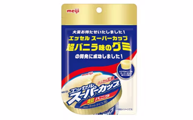 新商品は同社のアイス「明治 エッセル スーパーカップ 超バニラ」の味わいを再現したグミで、本物のアイスに似たカップ型の形状と、もっちりとしたかみ応えのある食感が特徴だ。2024年9月にX(旧ツイッター)の同社公式Xアカウントで「明治 エッセル スーパーカップ 超バニラ」味のスナックとグミのどちらを食べたいかという問いかけに対し、グミに1000件超の「いいね」が寄せられた反響を受けて商品化した。