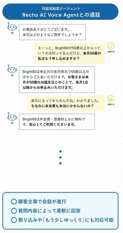 60歳以上の顧客向けに提供するサービス「Bright60(ブライトシックスティ)」への問い合わせが対象。電話をかければ自動的にAIオペレーターにつながる。業務効率化に加え、顧客の待ち時間や対応の「たらい回し」を減らす狙いがある。