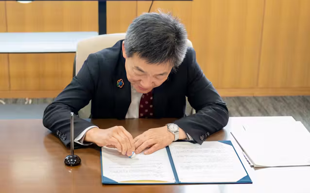 インキ消去機能紙は愛媛大学紙産業イノベーションセンターが開発した。植物由来の次世代素材「セルロースナノファイバー(CNF)」を紙の表面に塗布するなどし、インキの浸透を制御できる構造となっている。締結書に使う取り組みは今回が初めてだという。