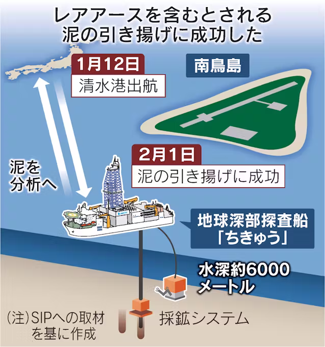 内閣府と海洋研究開発機構(JAMSTEC)は2日、小笠原諸島・南鳥島沖の水深約6000メートルの海底からレアアース(希土類)を含むとされる泥の引き揚げに成功したと発表した。泥を引き揚げた地球深部探査船「ちきゅう」は15日に清水港(静岡市)に戻る予定で、帰港後に泥の成分を分析する。2028年度以降に見据える産業化へ向けて、採算性の検証や精製技術の開発に役立てる。