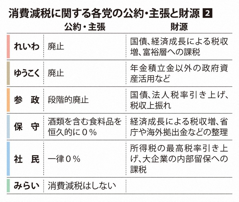 飲食料品の消費税を2年限定でゼロ%にすると主張する自民党と日本維新の会も、財源確保策は煮詰まっていない。赤字国債に頼らず、補助金や企業向け減税である租税特別措置の見直し、税外収入などで捻出するとしているが、十分な財源を得られるかは不透明だ。【古屋敷尚子、井口彩、加藤結花】