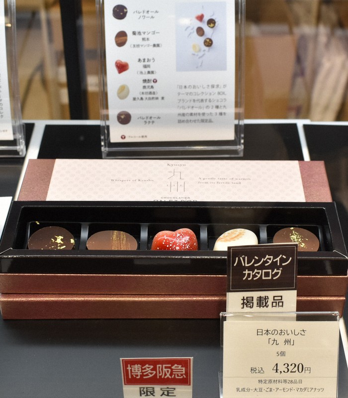 大丸福岡天神店(同区)は「九州チョコ深発見」がテーマ。出店する国内外63ブランドのうち、約半数が九州・沖縄からという。目玉は九州で活躍するショコラティエ8人が手がけた、同店限定の詰め合わせ「九州ショコラティエBOX」(3780円)。福岡産の日本酒や佐賀産イチゴなど九州の素材を取り入れた。同店によると主原料を含む資材費の高騰に伴い、店頭価格は平均で前年比の1・5倍に。それでも売り上げは好調で、広報担当者は「年一度のイベントなので、ご自身のために惜しみなく買う方もいらっしゃるようです」と分析する。
