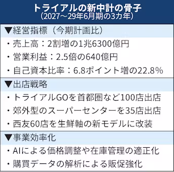 ディスカウントストア大手のトライアルホールディングスは12日、2029年6月期までの3カ年の中期経営計画を発表した。小型スーパー「トライアルGO」を首都圏中心に100店舗増やす。子会社の西友では既存90店を新業態に作り替える。低廉な生鮮品や総菜を強みに、競合の大手スーパーやコンビニエンスストアに対抗する。