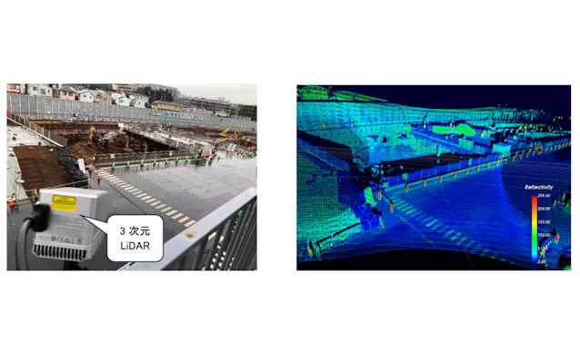 新開発のシステムでは複数の3Dライダーを併用し、仮設物による死角をカバーし合って土留め壁全面を非接触で監視する。土留め壁に設定値以上の変状が発生すると、自動で警報を出す仕組みだ。ライダーによる検出精度を高めるため、法政大学との共同研究の成果を応用した。