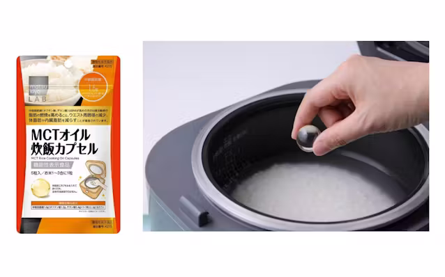 新商品は、BMIが高めの人の日常活動時の脂肪燃焼を高めたり、体脂肪や内臓脂肪を減らしたりする効果があるとされる中鎖脂肪酸(オクタン酸、デカン酸)を含む食油「MCTオイル」をカプセル化したものだ。炊飯時にお米と一緒に入れるだけで、脂肪燃焼を支援するという。またオイルコーティングの効果でごはんがつややかでふっくらと炊け、時間がたってもおいしさを維持する。