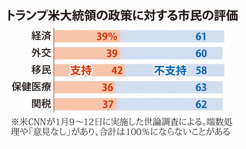高関税政策は国民の間では物価高を引き起こすとの懸念が根強い。1月のCNNの世論調査では62%が「不支持」と回答し、「支持」(37%)を大きく上回っていた。