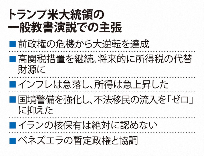 一般教書演説は米大統領が年1度行い、国の現状や内政・外交の基本方針を示す。今回はトランプ氏にとって2期目の就任後初で、1時間47分に及んだ。米メディアによると記録が残る1964年以降で最長だった。【ワシントン金寿英】
