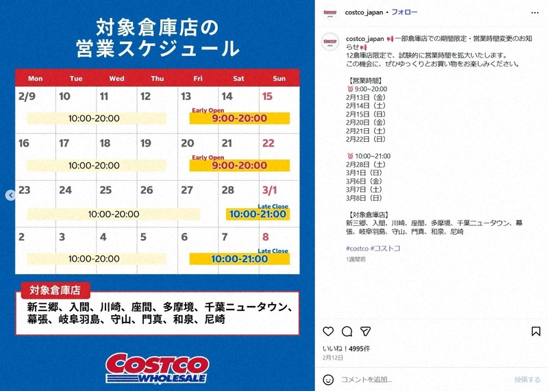 大型量販店のコストコも営業時間の拡大を検討している。2~3月の一部日程で、首都圏など12店舗の営業時間を試験的に1時間延長する。