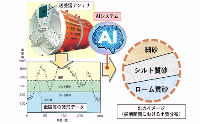 新技術では、シールド機前方の掘削面にある送受信アンテナから発信した電磁波の波形データをAIで解析して土質や支障物を探査する。従来の人による波形データの評価に比べてばらつきを減らしてシステムの精度を高め、リアルタイムで状況変化を把握することで掘削の効率化・安全性の向上を支援する。