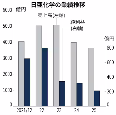発光ダイオード(LED)大手の日亜化学工業が26日発表した2025年12月期の連結決算は、純利益が前の期比33%減の213億円だった。最終減益は3期連続。電気自動車(EV)の世界的な需要減少を受けてリチウムイオン電池の正極材料の生産設備で未稼働が発生し、減損損失を95億円計上した。売上高は8%減の3640億円だった。