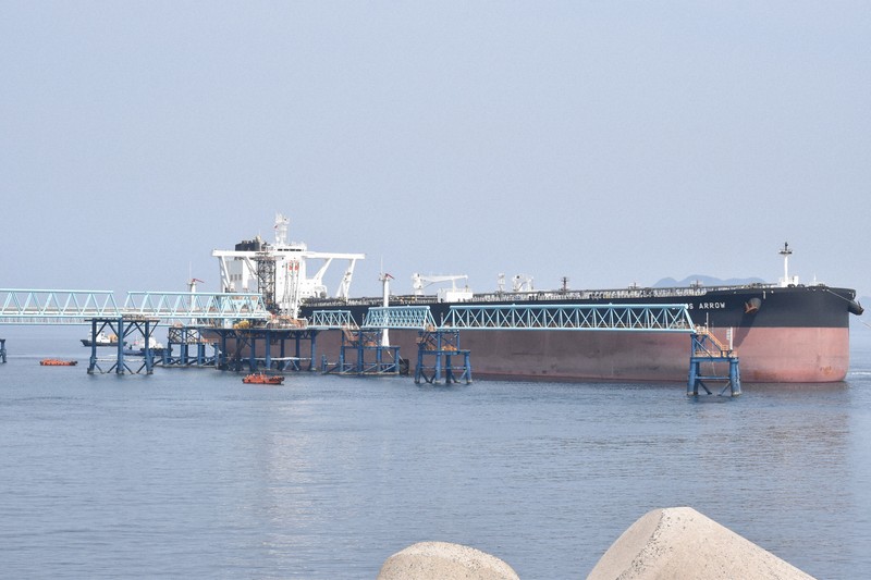 白島基地は原油の入った貯蔵船を海洋に浮かべて備蓄する洋上タンク方式の基地。27日午後3時半ごろ、中央監視制御室の号令で、貯蔵船から約840メートルの配管橋を通り、停泊したタンカーに原油放出を開始した。