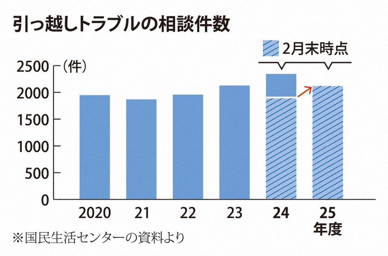 国民生活センターによると、全国の消費生活センターに寄せられた引っ越しトラブルに関する相談は、2025年度は2月末までに2118件に上っている。前年の同時期(1904件)を上回るペースだ。