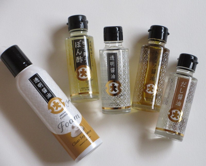 「透明醬油」「柚子舞うぽん酢」「だし醬油」(各100ミリリットル、540円)、白トリュフオイルと黒トリュフの粒を加えた「トリュフ醬油」(100ミリリットル、864円)、泡状の「フォーム」(150ミリリットル、2180円)。公式オンラインショップ、全国のスーパーや百貨店で販売。フンドーダイ(0570・200・545)。