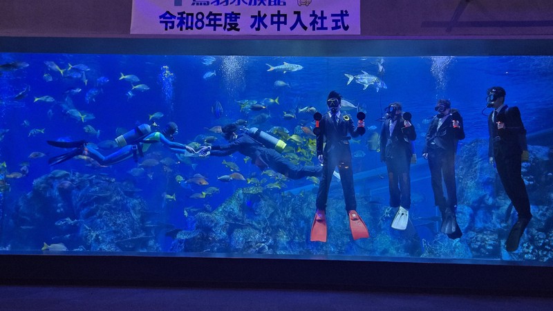スーツ姿の新入社員が水槽に潜って辞令を受ける「水中入社式」が3月31日、三重県鳥羽市の鳥羽水族館であった。新人6人のうち、飼育研究部に配属される5人がアオウミガメやナポレオンフィッシュなど3000匹の魚たちに見守られながら新たな一歩を踏み出した。