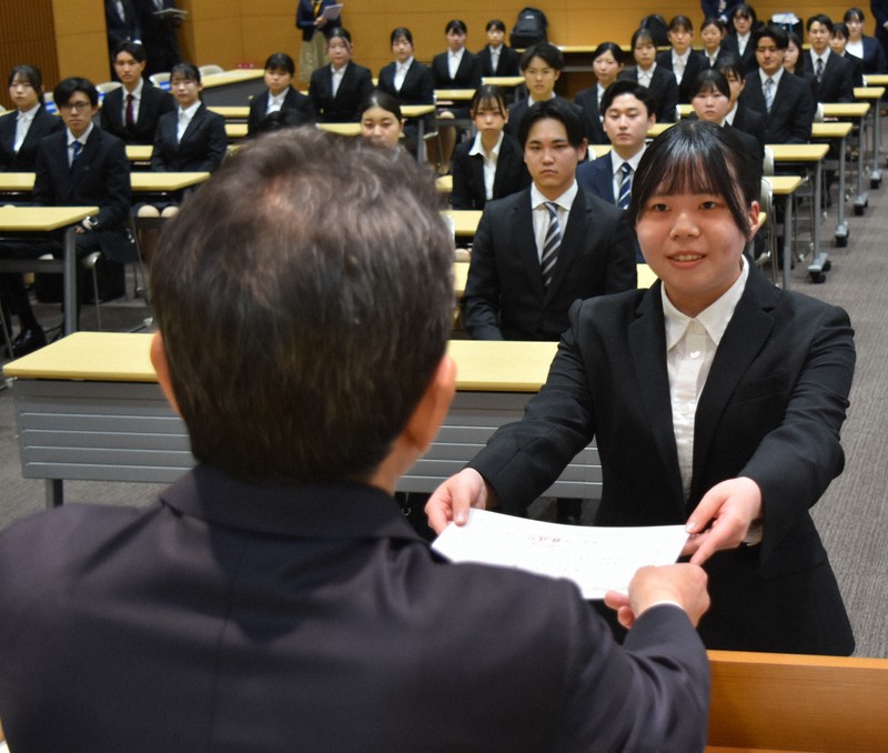 小林頭取は「伝えたいことは3点。お客様や地域に真剣に向き合い、信頼される行員になること。失敗を恐れず、挑戦し続けること。チームワークを大切にすること」と強調。「自分自身の可能性を信じ、仲間と共に切磋琢磨(せっさたくま)しながら、地域とお客様にとって、なくてはならない存在へと成長してほしい」と激励した。