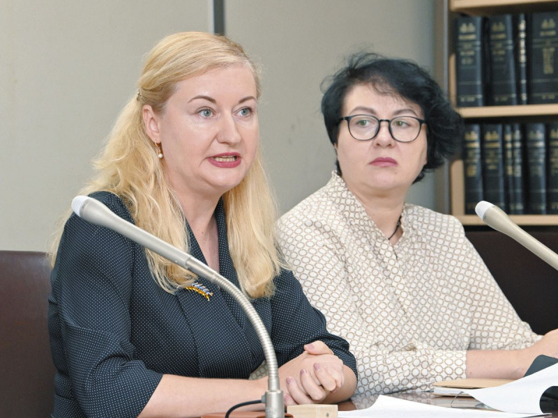 「外国法事務弁護士」の正式登録を終え、記者会見するイリーナ・ウリバチョバさん。右は姉のタチアナ・ホンチャレンコさん=2日、東京・霞が関の司法記者クラブで(中村千春撮影)