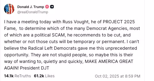 「私は今日、『プロジェクト2025』で知られるラス・ボート氏と会い、ほとんどが政治的な詐欺に過ぎない民主党系機関の中から、どれを削減すべきか話し合うことになっている」