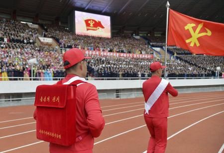 北朝鮮の金正恩朝鮮労働党総書記への忠誠を誓う手紙をリレー形式で運ぶ人たち=7日、平壌(共同)