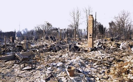 山火事で焼け落ち、廃虚と化した米ロサンゼルス西部パシフィックパリセーズの高級住宅街=1月(共同)