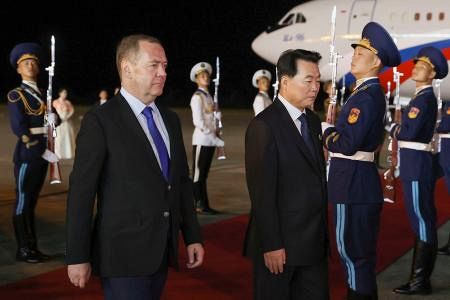 北朝鮮の朝鮮労働党創建80年の記念行事に出席するため、平壌に到着したロシア政権与党「統一ロシア」のメドベージェフ党首(左)=8日(タス=共同)