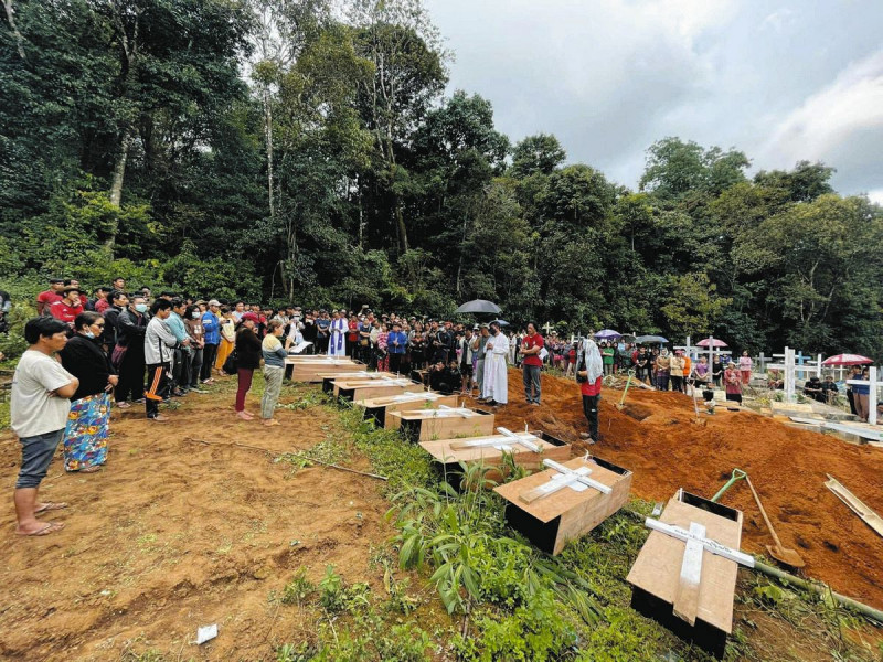 2024年9月の空爆で死亡した人々を埋葬する避難民ら=ミャンマー北東部シャン州ペコン郡区で(オンマーカインさん提供)