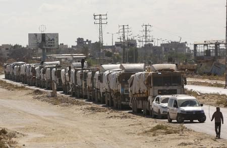 14日、停戦合意を受けパレスチナ自治区ガザに入った人道支援物資のトラック(ゲッティ=共同)