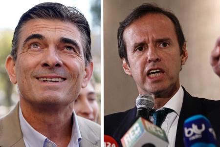 ボリビア大統領候補のホルヘ・キロガ元大統領(右)とロドリゴ・パス上院議員(AP=共同)