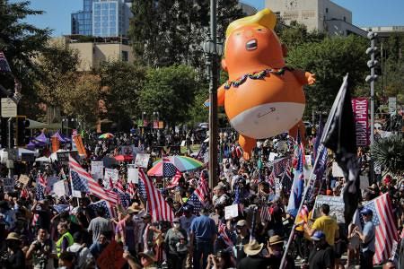 トランプ大統領の政策に抗議する「No Kings」デモの参加者たち=18日、ロサンゼルス(ロイター=共同)