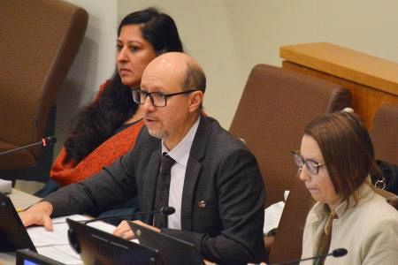 国連総会の第3委員会(人権)で発言する特別報告者のマルコス・オレリャーナ氏(中央)=23日、米ニューヨークの国連本部(共同)