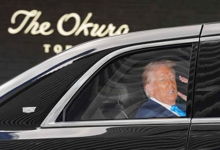 宿泊先のホテルを出発するトランプ米大統領=29日午前、東京都港区