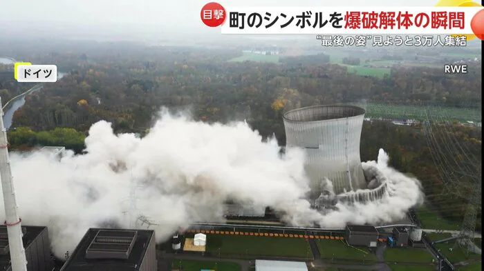 ドイツ南部の町で、巨大な原子力発電所の冷却塔が爆破解体される様子がカメラに捉えられた。原発廃止を進める政策の一環で行われ、街の象徴だった建造物が姿を消した。