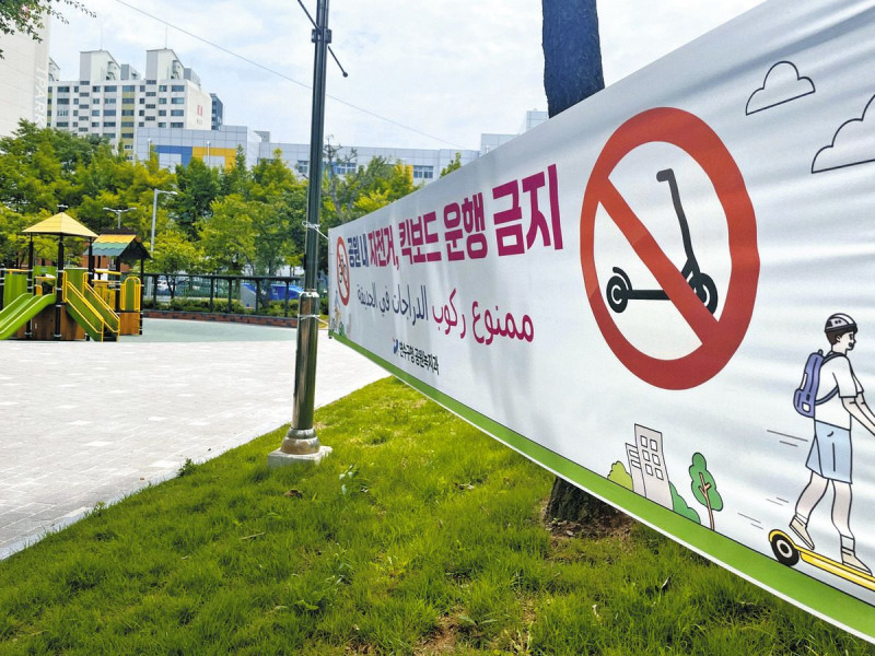 韓国語とアラビア語で注意書きが書かれた横断幕がかかる公園=韓国・仁川で(斎藤雄介撮影)
