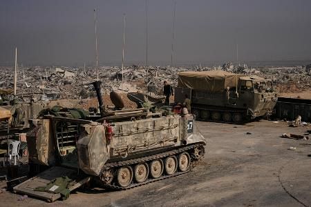 ガザ北部ガザ市で、破壊された建物周辺に集まるイスラエル軍の車両=5日(AP=共同)