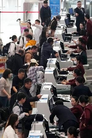北京首都空港の日本便などを扱うカウンターで搭乗手続きをする人たち=15日(共同)