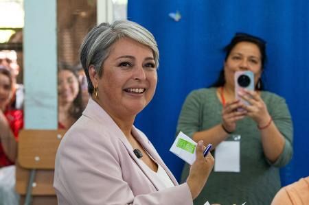 16日、チリ大統領選で投票するジャネット・ハラ候補=サンティアゴ(ゲッティ=共同)
