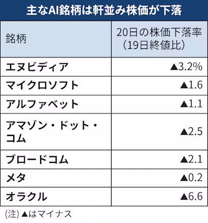 エヌビディアも朝方の上昇を帳消しにして3%安で引けた。マイクロソフトやアマゾン・ドット・コムなど、AI投資に積極的な主要テック銘柄もそろって同様の株価推移をたどった。金融市場の不安心理を映すとされる変動性指数(VIX)は26.42と、終値として4月下旬以来の高水準だった。