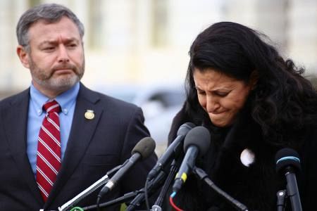 記者会見で涙ぐむハナンさん(右)=21日、米ワシントン(共同)