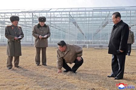 北朝鮮北西部・新義州周辺で完成間近の温室農場を視察する金正恩朝鮮労働党総書記(左から3人目)=26日(朝鮮中央通信=共同)