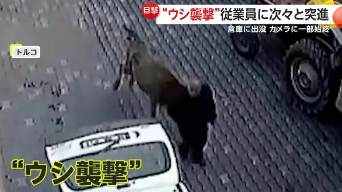 トルコで、突然倉庫に現れた牛が従業員に突進する様子がカメラに捉えられた。従業員たちは逃げまどいながらも牛を外へ追い出したという。