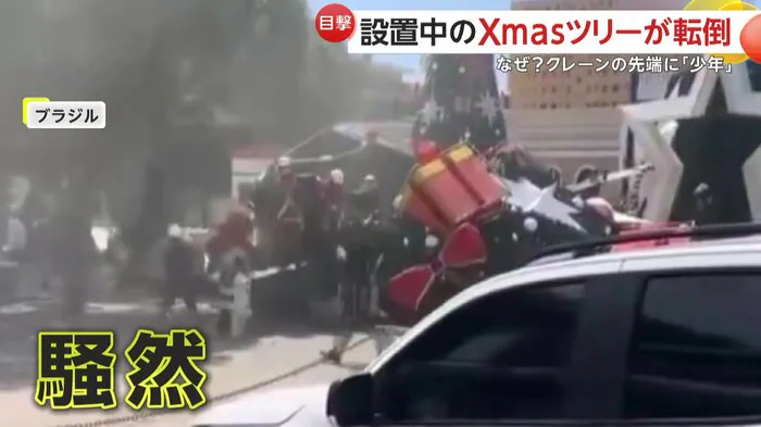 ブラジルで、巨大なクリスマスツリーを運搬中のクレーンが倒れる瞬間がカメラに捉えられた。