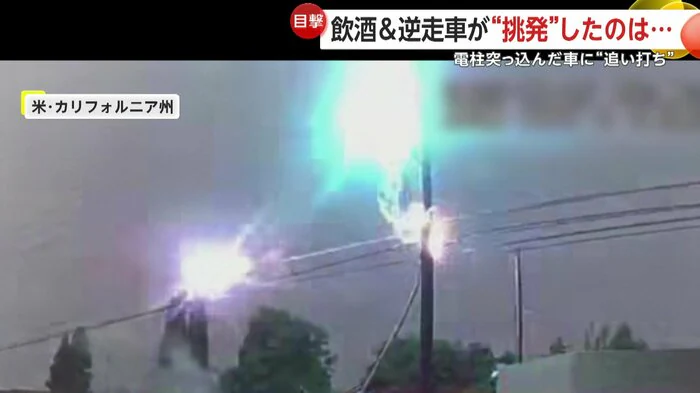 アメリカ・コロラド州で、逆走車がパトカーに挑発する瞬間がカメラに捉えられた。一方、カリフォルニア州では、飲酒運転の車が電柱に衝突。電線から火花が散り、危険な状況だった。
