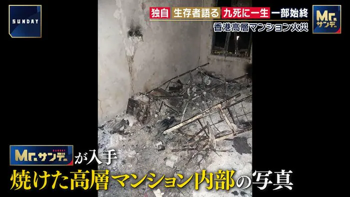 Mr.サンデーが入手したのは、焼き尽くされた高層マンションの室内で撮影された写真。椅子や、棚のような物の残骸が横たわり…窓枠は大きくねじ曲がっている。