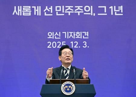 記者会見する韓国の李在明大統領=3日、ソウル(共同)