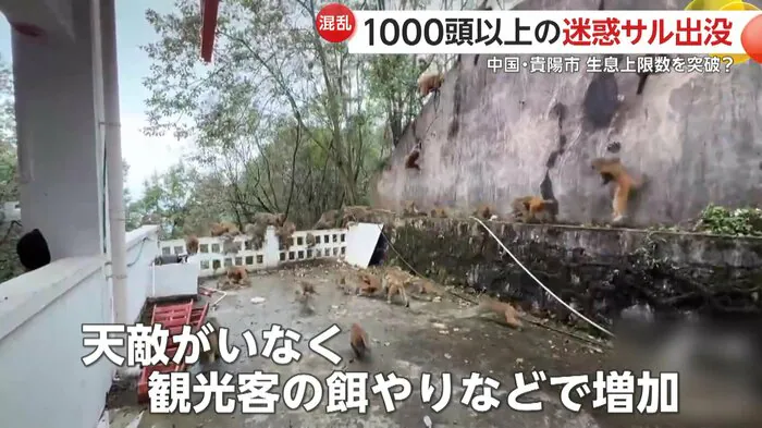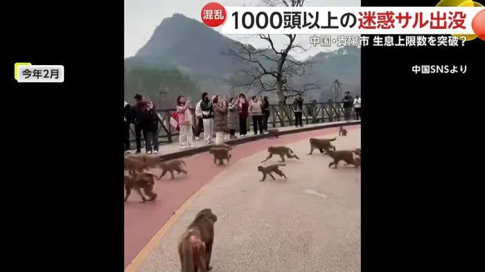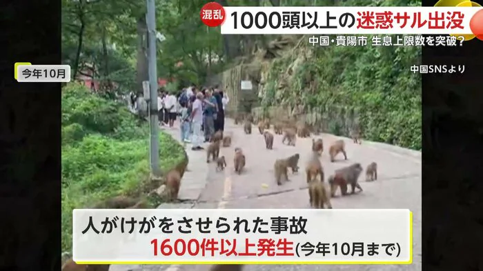 中国南西部・貴州省貴陽市の観光地「けん霊山公園」でサルが急増し、大きな問題になっている。現在では、何と1000頭以上が生息しているといい、原因は、観光客の餌やりなどだという。さらに、多くの観光客が訪れる公園では、サルとのトラブルが頻発し、2025年10月までに人身事故1600件以上発生している。そんな中、市街地にもサルが出没し、被害が広がっているという。