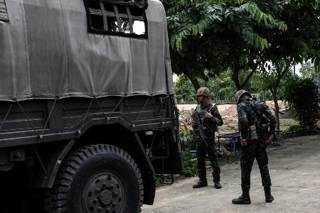 タイ・スリン県で軍用車の近くに立つタイ軍兵士=7月(ゲッティ=共同)