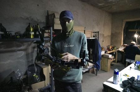 ウクライナ・ワシリキウカ郊外の工場で、無人機を製造するエンジニア「ナンバーエイト」=9月