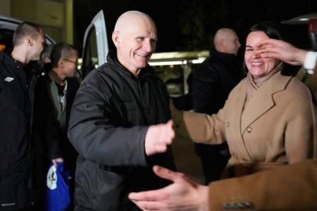 釈放後、リトアニアの米国大使館に到着し、ベラルーシの反体制指導者らに迎えられるビャリャツキ氏=13日(ロイター=共同)