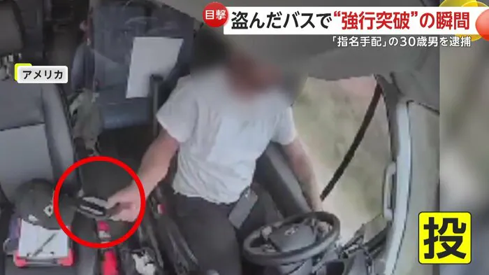 窓から財布のようなものを投げ捨てる男。運転していたのは、盗んだバスだった。